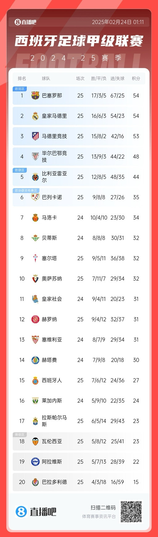 争冠白热化! 西甲积分榜: 巴萨、皇马同分排1、2, 马竞落后1分第3
